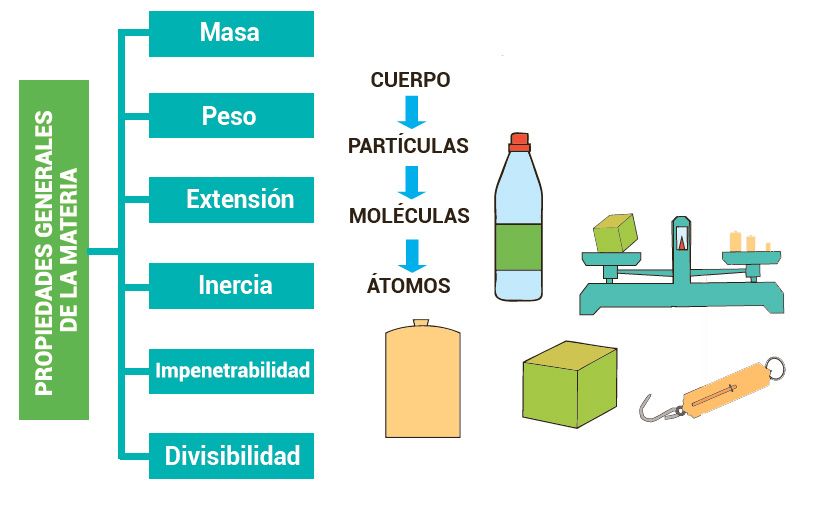 Comúnmente se divide a sus propiedades en propiedades generales (es decir, de todas las materias), y propiedades específicas, que son las características particulares que presenta un caso material.